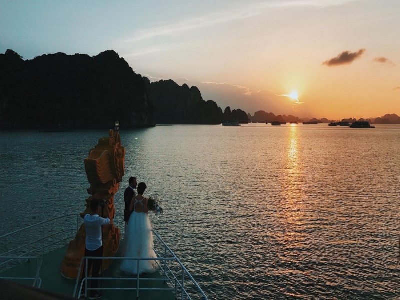 Capture romance at golden hour in Ha Long Bay – perfect light for honeymoon photos. (Source: Collected)
