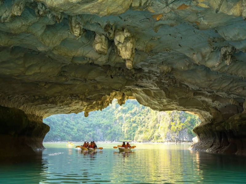 Once your boat anchors near the cave, you’ll hop into a kayak or bamboo boat and glide into a low-ceiling tunnel that leads into the hidden lagoon.