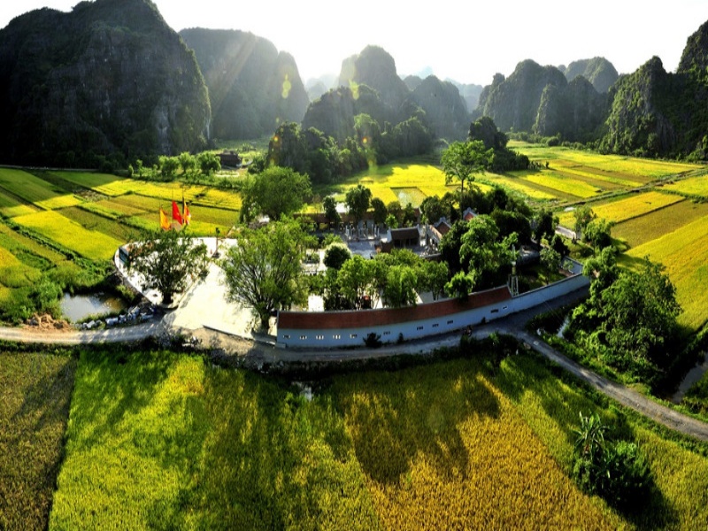 Thai Vi Temple lies inside the Tam Coc – Bich Dong complex, approximately 1.5 km from Tam Coc boat wharf. The path leading to the temple passes rice fields, small rivers, and limestone cliffs — ideal for walking or cycling.
